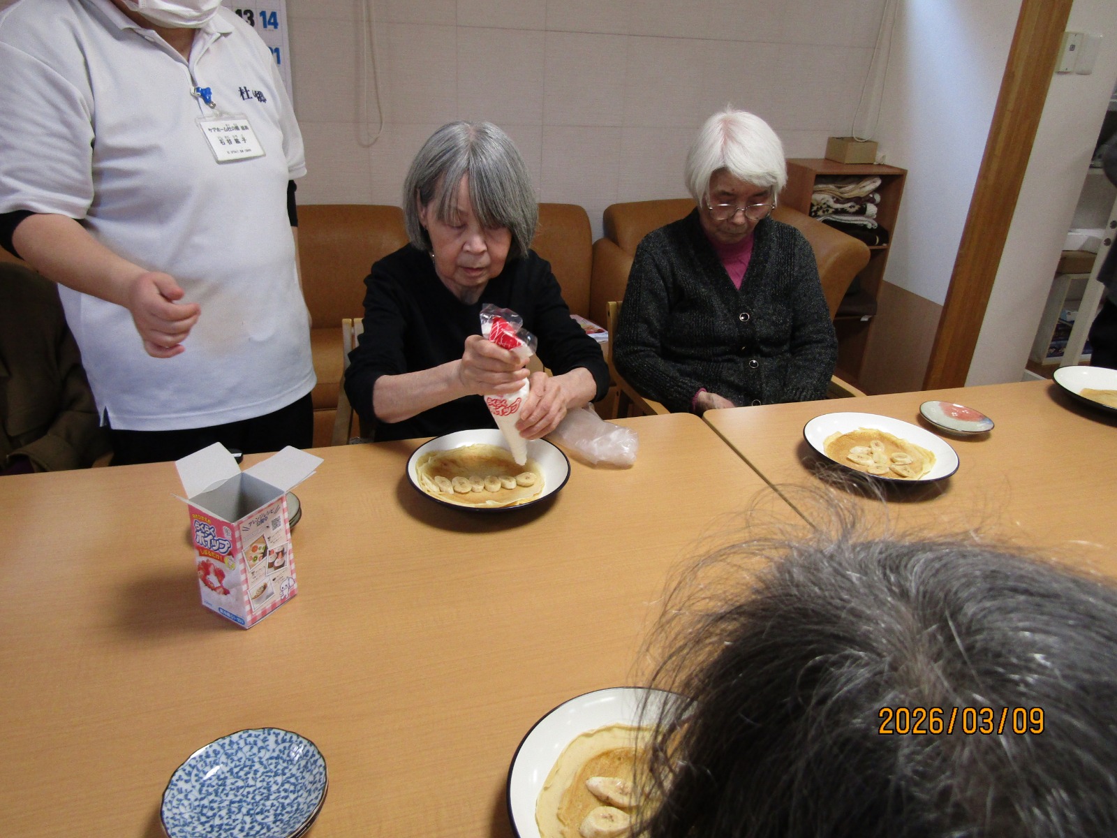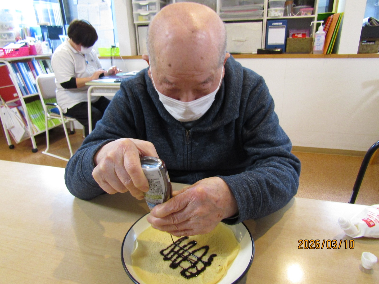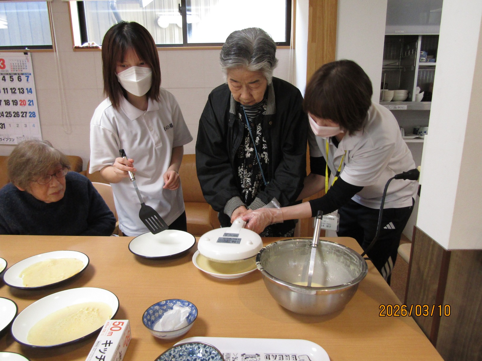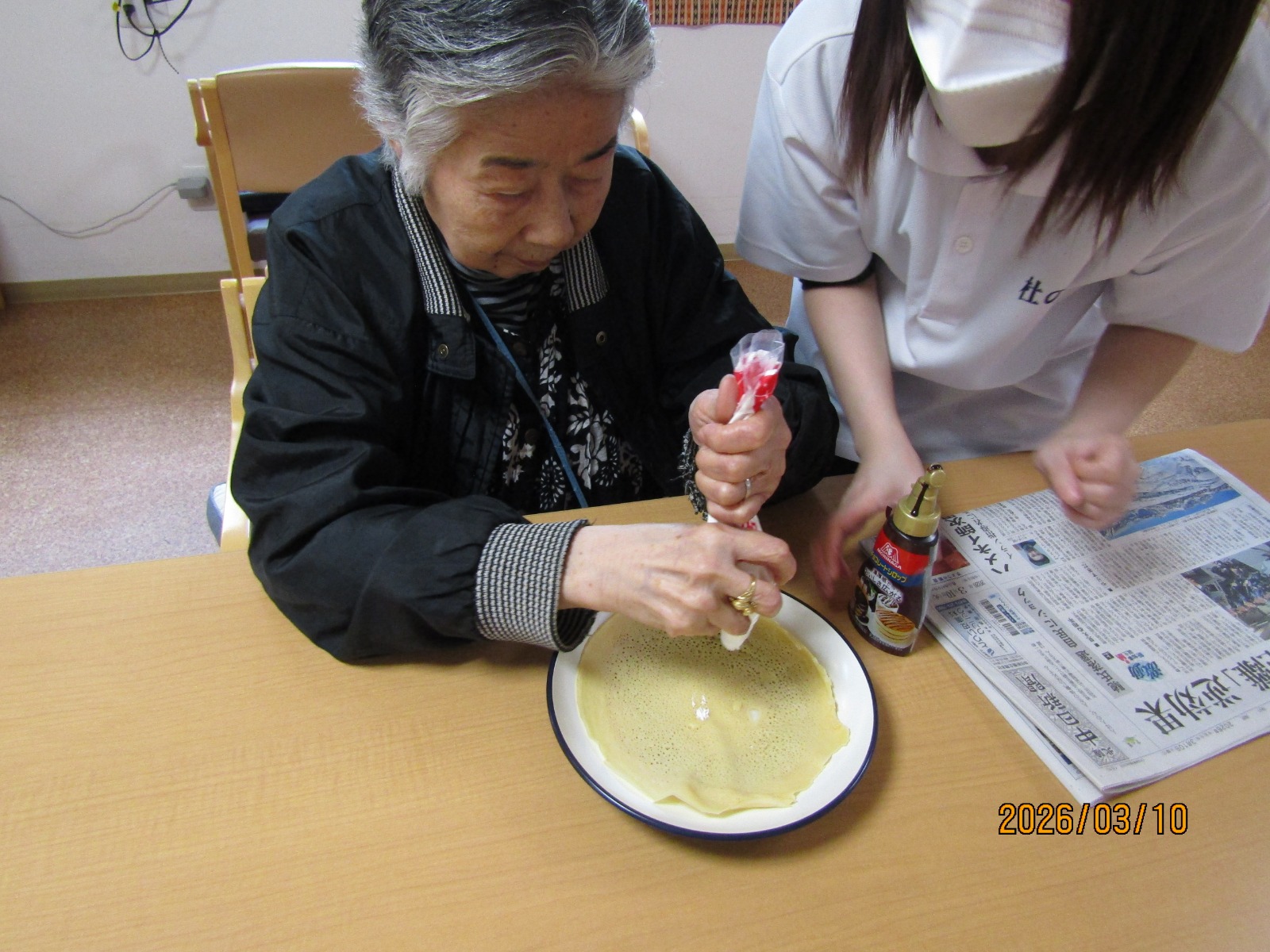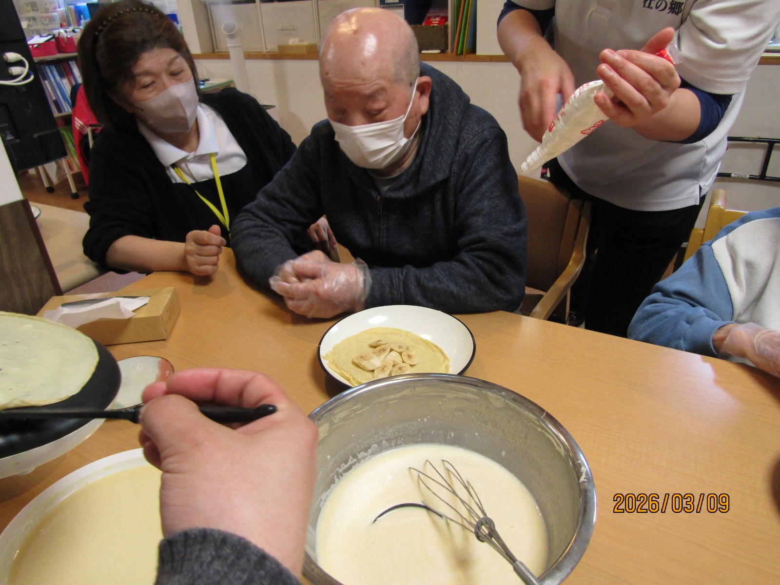 3月9日に利用者様と一緒にクレープ作りを行い、3月10日にはベビーカステラをおやつの時間に提供させていただきました🤤