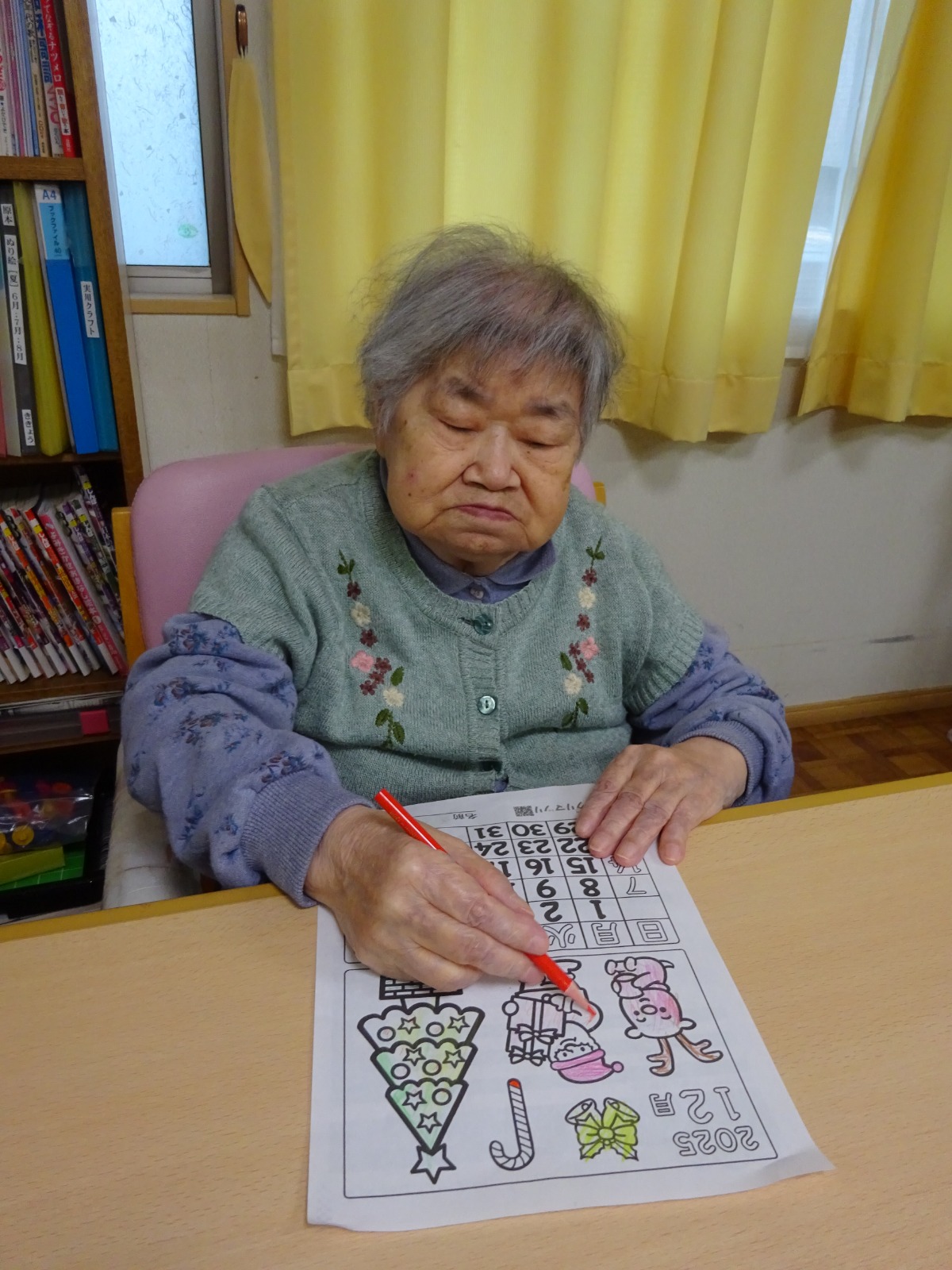 12月のカレンダーに色を塗っています。🖍️