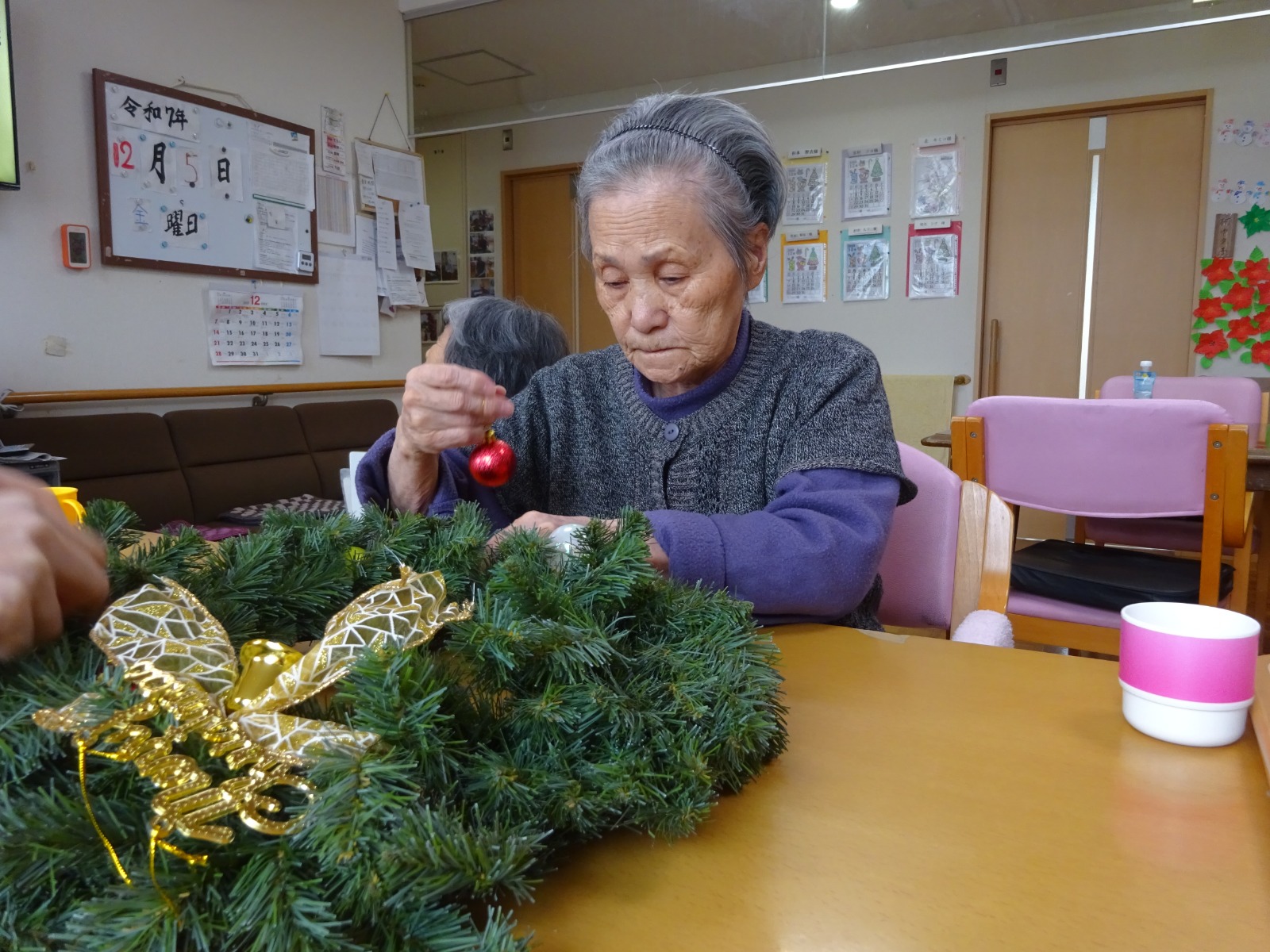 クリスマスリースに飾り付けです。🎄