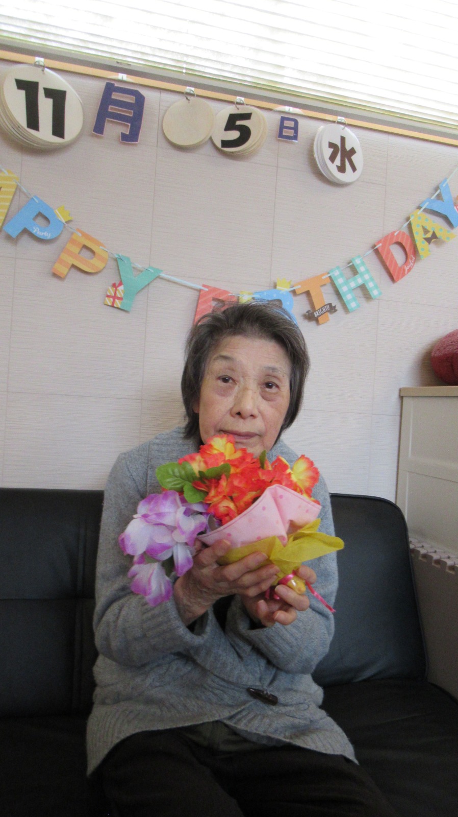 11月5日と11月20日に誕生会を開催しました。お二方ともお肉が食べたいとのことで5日にすき焼き、20日に焼肉を召し上がりました。美味しかったです☆皆さんからお祝いの言葉をいただいて嬉しそうにされていました♪