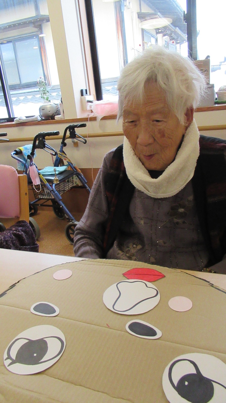 お正月3日目は福笑いを楽しまれました。ご自分で作られた顔がとんでもないものになり大爆笑されている方が多かったです。笑いや笑顔でホームがとても暖かくなりました。